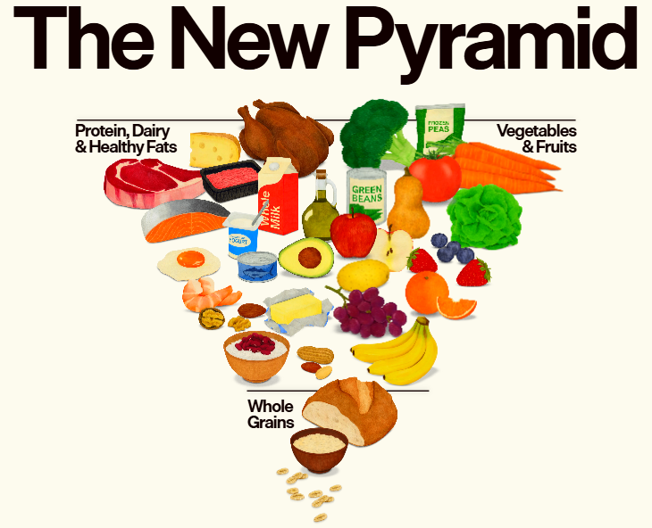 The new pyramid endorses incorporating healthy fats from meats, seafood, eggs, nuts, seeds, olives and avocados into a healthy daily diet. The new website states that healthy fats from natural sources can encourage vitamin absorption and brain and hormone health. That marks a departure from dietary guidelines in place since 1980 hammering saturated fats, stoking increased consumption of industrial seed oils.