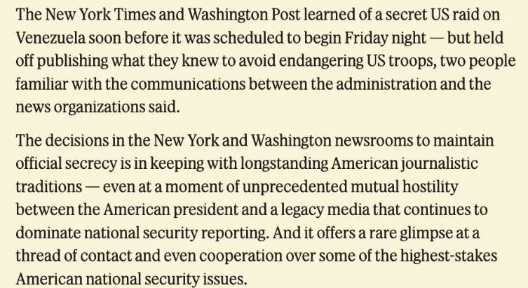 Two anonymous sources, described as familiar with the communication between the administration and media outlets, told Semafor that both outlets declined to break the news on the operation before it happened out of concern for U.S. troops involved. The military incursion, carried out early Saturday, resulted in the capture and ouster of socialist dictator Nicolás Maduro, whom a grand jury later indicted on four charges, including narco-terrorism conspiracy.