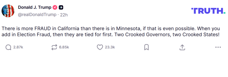 “There is more FRAUD in California than there is in Minnesota, if that is even possible,” Trump wrote on TRUTH Social. “When you add in Election Fraud, then they are tied for first. Two Crooked Governors, two Crooked States!”