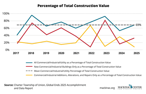 Even official data presented at the March 25 trustee meeting shows the township largely unchanged over time. The value of all commercial, industrial and utility construction as a “percentage of total construction value” was less in 2025 than it was in 2020, when the township brought on a new economic development official. There was a spike in 2023, but that was likely caused by building a new county jail, not new private business activity.