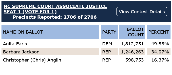 Chris Anglin split the Republican vote in 2018, allowing Democrat Anita Earls to win the North Carolina Supreme Court race in 2018. Source: North Carolina State Board of Elections.