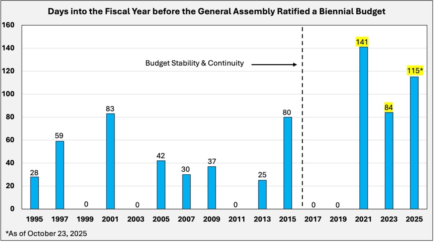 The first two biennial budgets following the 2016 reform were both completed before July 1, but each faced a veto, and only in 2017 did lawmakers successfully override it. Since then, ratification has shifted from a predictable summer event to an increasingly delayed fall affair. In fact, for the three most recent biennia — 2021, 2023, and 2025 — the General Assembly has ratified budgets later than in any other cycle since at least 1995.