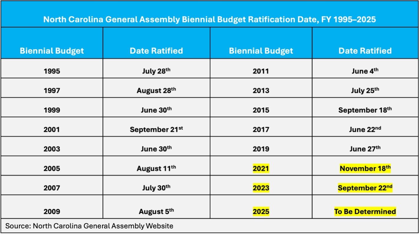 The table below shows the dates the North Carolina General Assembly ratified biennial budgets for fiscal years 1995–2025. In other words, these are the dates when lawmakers passed a whole two-year budget and sent it to the governor for signature or veto.