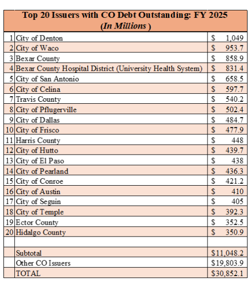 Per the report, CO debt outstanding increased “from $13.24 billion outstanding in fiscal year 2016 to $30.85 billion outstanding in fiscal year 2025.” Of this amount, the top 20 highest users accounted for more than 35% of all CO debt outstanding. As seen below, those users included a mix of city governments (14), county governments (5), and one hospital district.