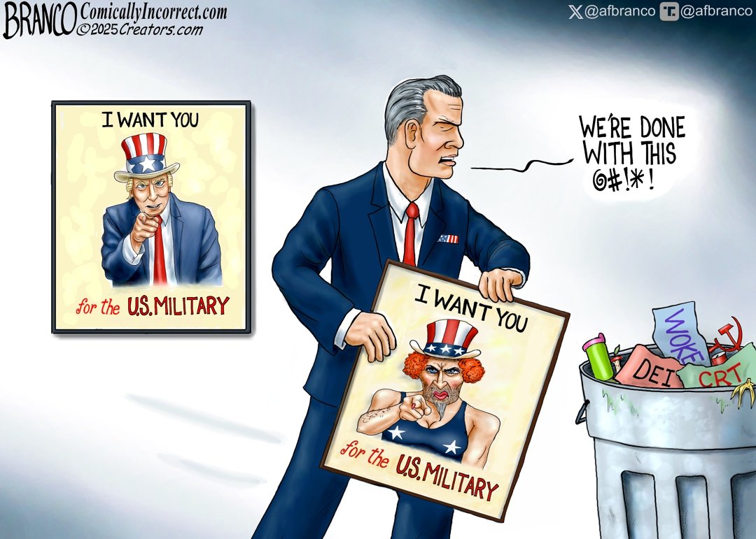 A.F. Branco Cartoon – Sec. Hegseth has removed the woke nonsense from the military, moving to a merit-based structure, saying, “we’re done with that sh-t”.